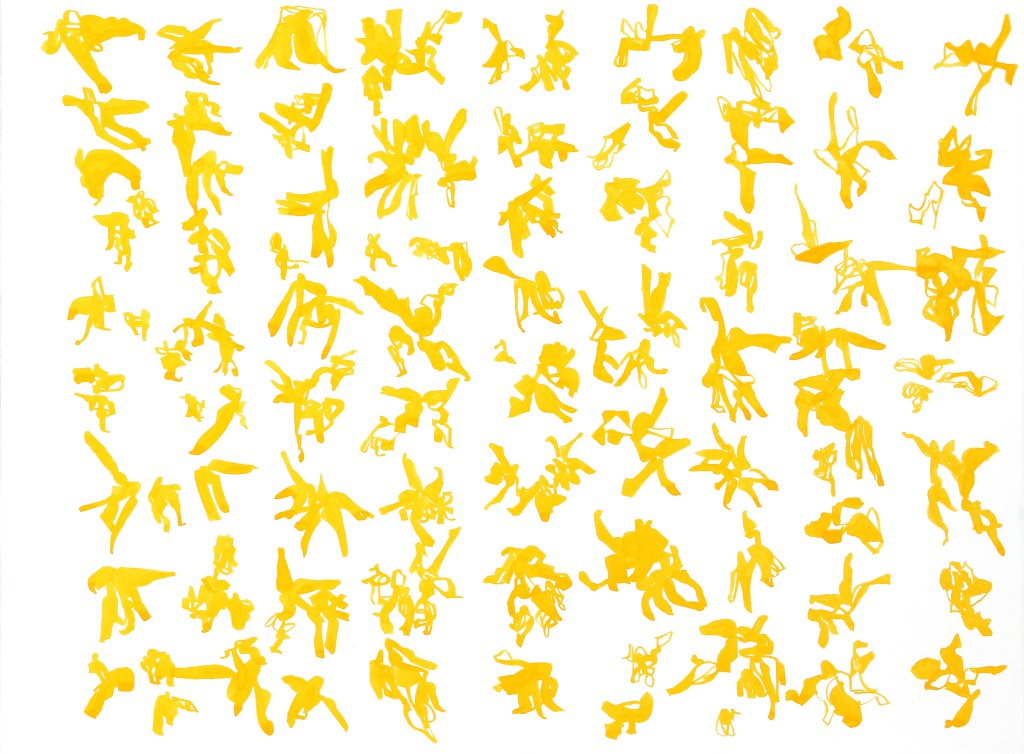 Diese Arbeiten stehen in auffälligem Gegensatz zu anderen Werken der Ausstellung, die gerade durch ihre lichtvolle Helligkeit die Blicke auf sich ziehen. Statt eines schwarz gefärbten aber transluzenten Untergrundes bildet hier eine opak weiße Papieroberfläche die Grundlage für die auf ihr erscheinenden, ausnahmslos in Gelb gehaltenen Zeichnungen, die ihre visuelle Präsenz einem Prozess des Auftragens und nicht des Wegnehmens von Material schulden.