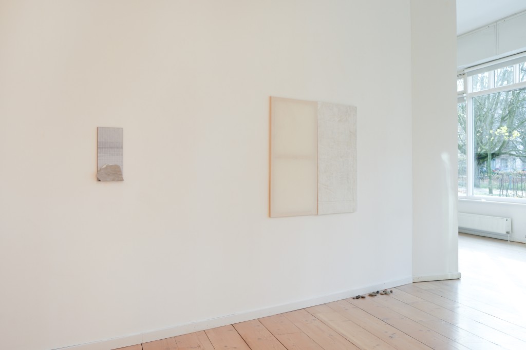 Links: Delia Jürgens, Blank Space, 2016–2017 / 2025, Baumwolle auf Keilrahmen auf Baumwolle, Steine vom Leo Carillo Beach in Malibu, Los Angeles, 115 x 60 cm