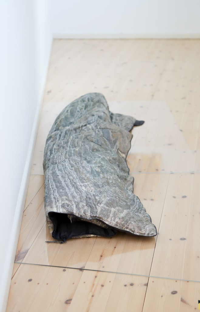 Delia Jürgens, CV(DH - Python), 2018, Pigmentierter Tintenstrahldruck eines dekonstruierten Stockfotos von mineralisiertem Gestein auf Transferfolie auf der Oberfläche eines Schlafsacks, 2 Acrylglasplatten, 185 × 120 cm, Foto: Angelina Kalachenkova